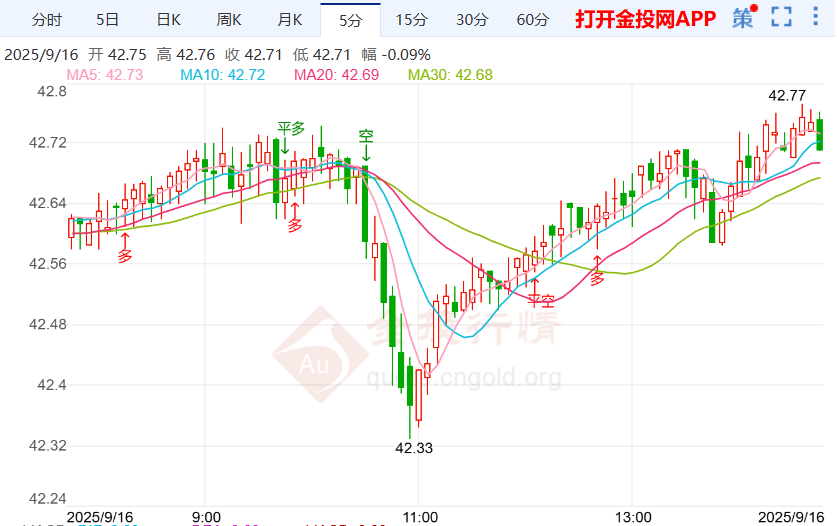 今日周二(9月16日)欧盘时段,国际白银目前交投于42.68一线上方,今日开盘于42.65美元/盎司,截至发稿,国际白银暂报42.74美元/盎司,上涨0.14%,最高触及42.77美元/盎司,最低下探42.32美元/盎司,目前来看,国际白银盘内短线偏向震荡走势。